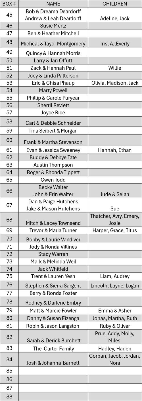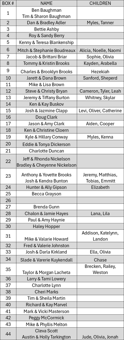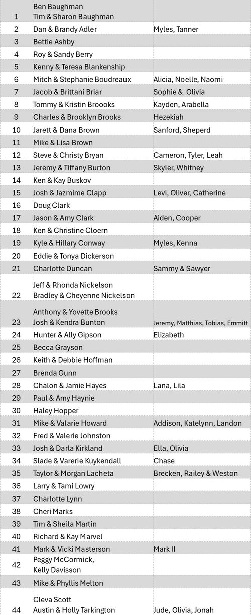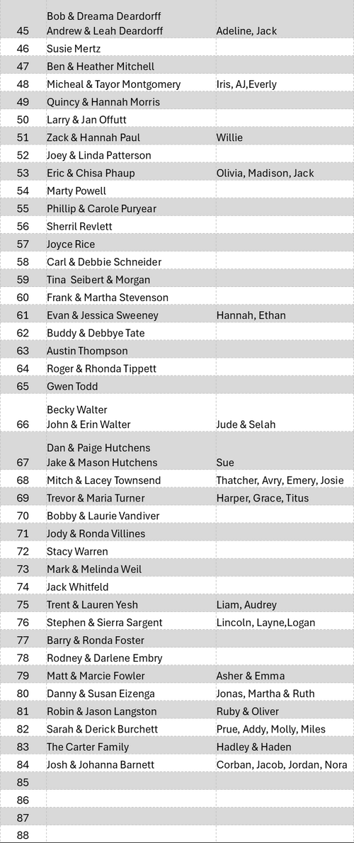 If your name was accidentally left off of this list, please let us know. We have tried to compile an accurate list, but we are only human and mistakes happen. Please contact the church office and we will get you added.