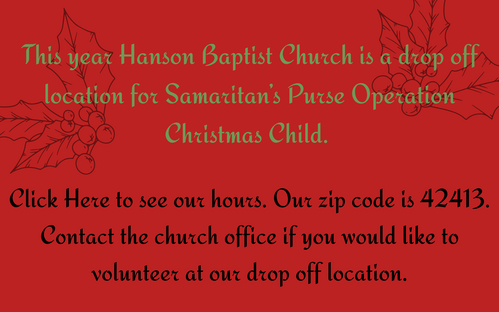 This year Hanson Baptist Church has a goal of 300 boxes! We hope that all of our church family will join us in reaching 300 kids this year with the Gospel!